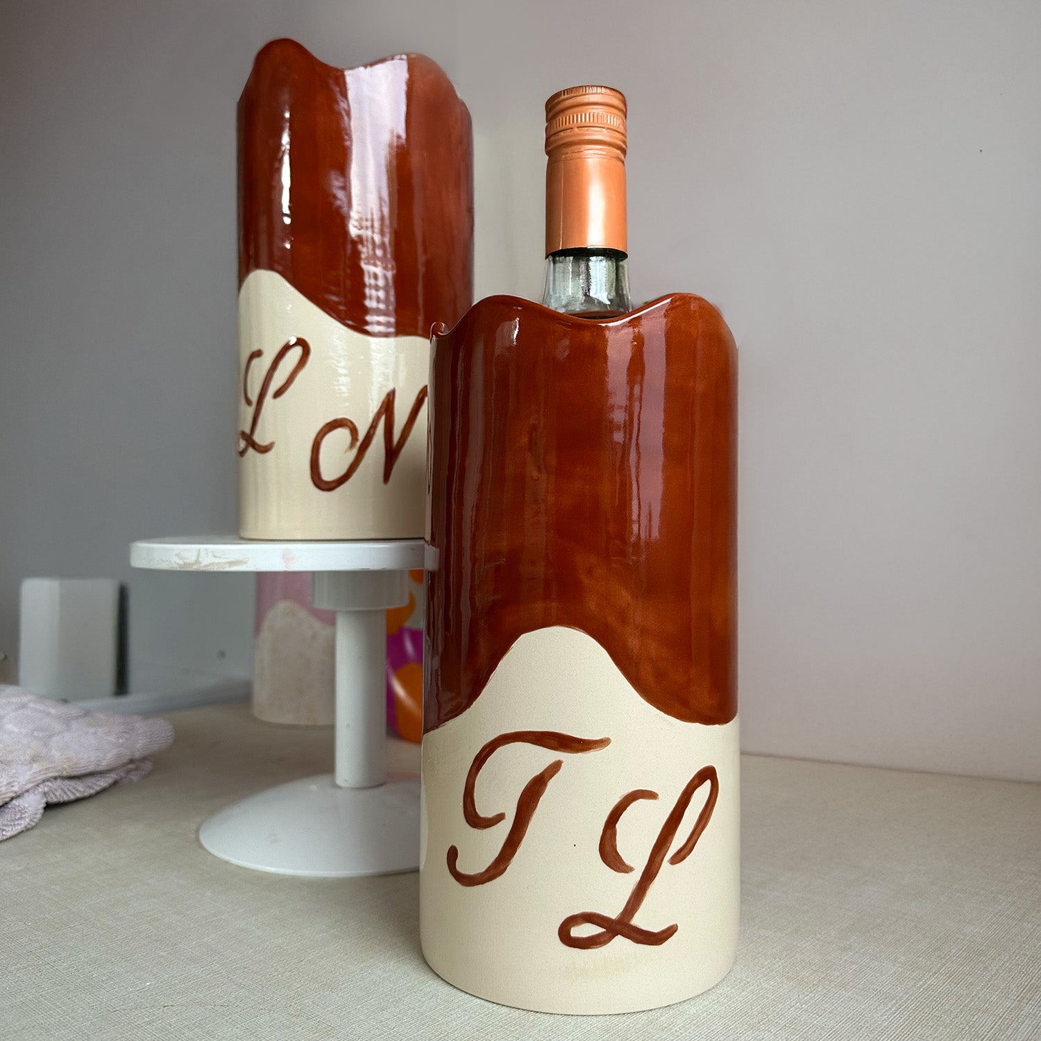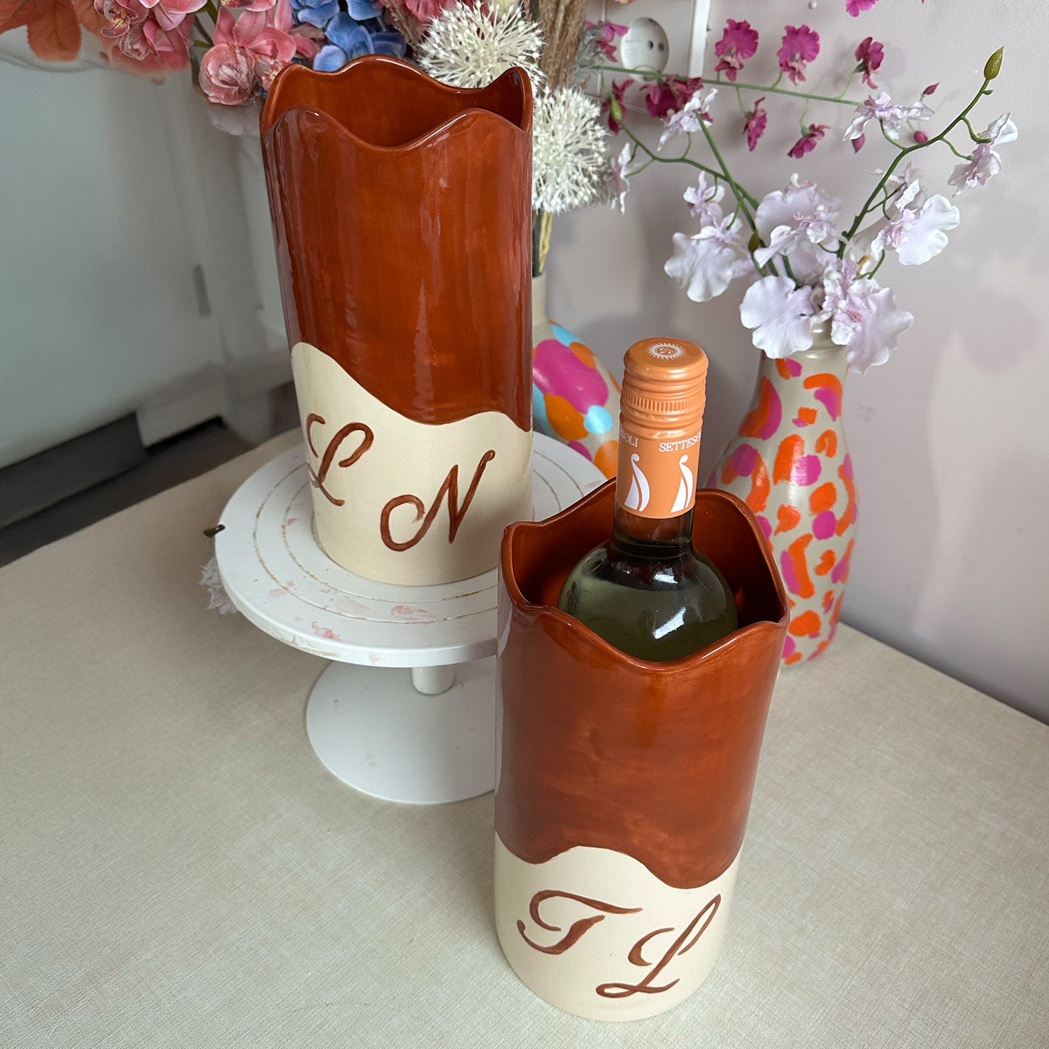 Deze handgemaakte wijnkoeler wordt precies zoals jij hem wilt. Kies je favoriete kleuren, voeg een naam toe, initialen of zelfs een speciale datum. Alle wensen zijn bespreekbaar!