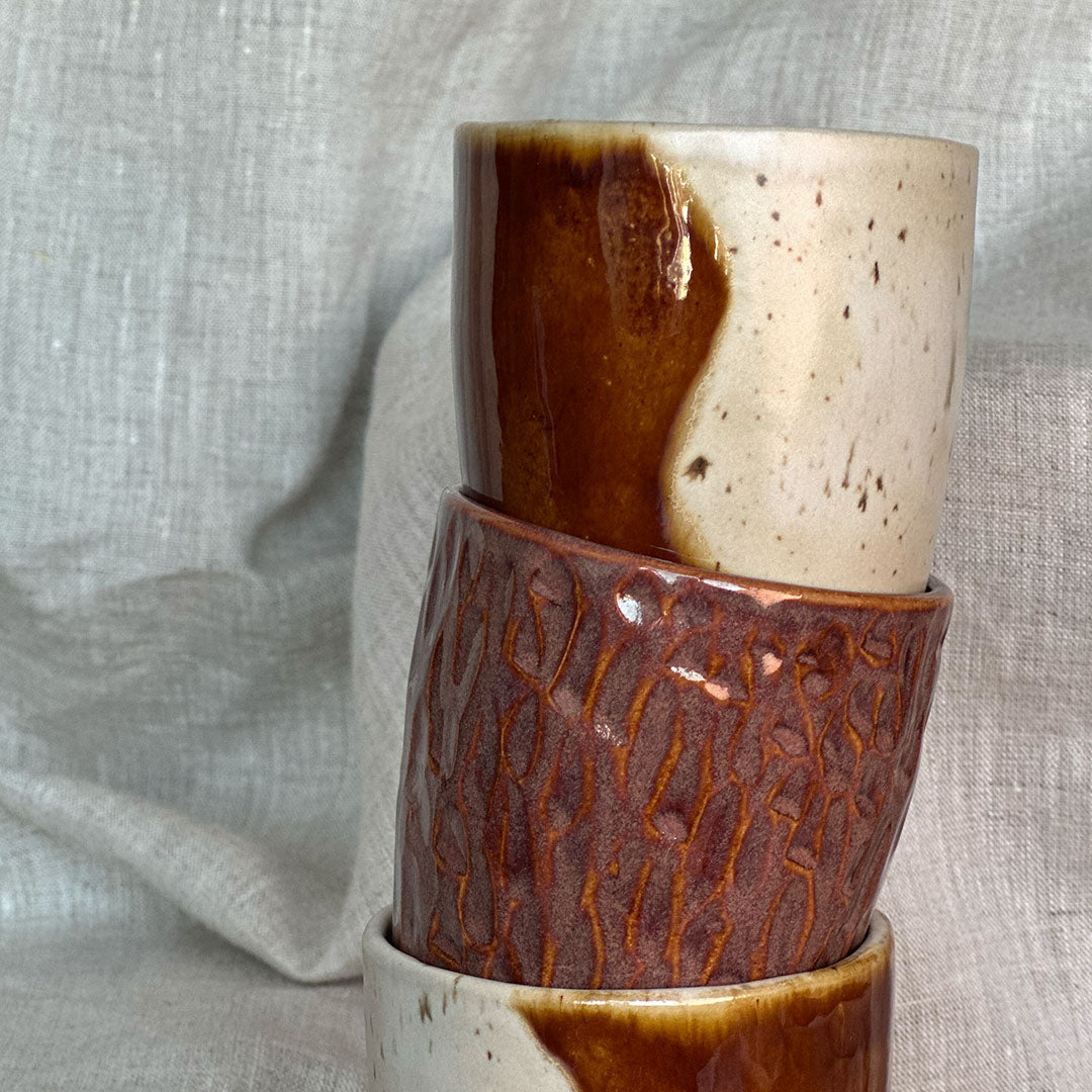 Alle keramiekstukken worden met de hand gemaakt in ons atelier. De klei droogt een week voordat het voor de eerste keer op 1050°C wordt gebakken. Na 1,5 dag afkoelen volgt het glazuren en aanbrengen van patronen. Elke kleur bestaat uit drie lagen. Vervolgens wordt het servies op 1240°C gestookt – hier ontstaat de magie! Door deze hoge temperatuur is het servies vaatwasserbestendig. Kleine variaties en imperfecties maken elk stuk uniek.