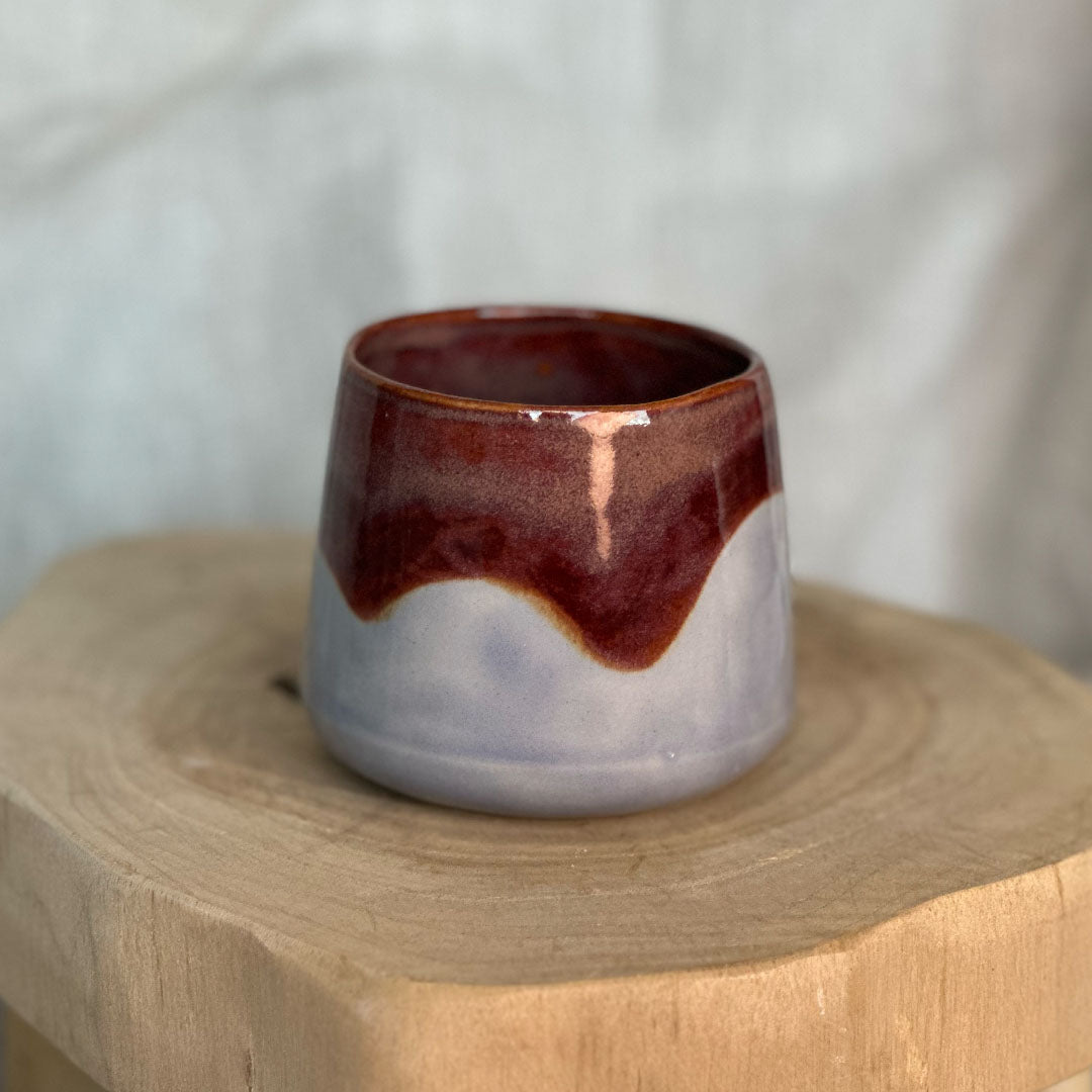 Koffiekop Wimbi in de combinatie van wijnrood en ijsblauw! 'Wimbi' betekent 'golf' in het Swahili, en de prachtige golvende rand van deze mok is geïnspireerd op de bewegingen van water.