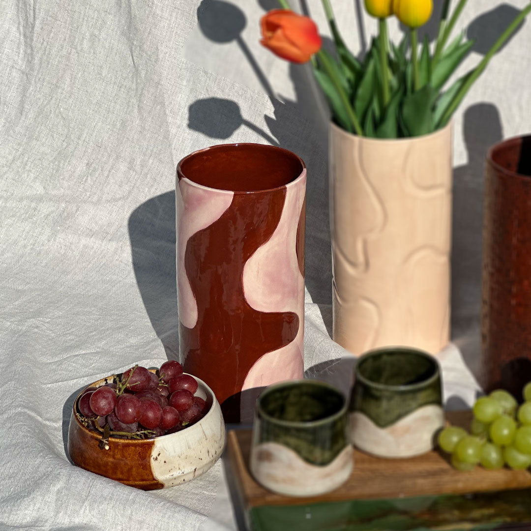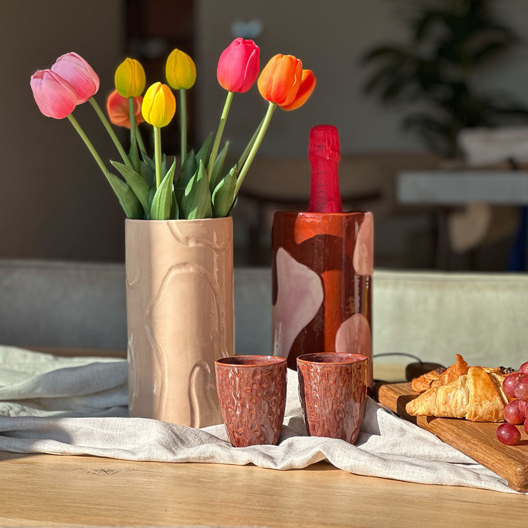 Alle keramiekstukken worden met de hand gemaakt in ons atelier. De klei droogt een week voordat het voor de eerste keer op 1050°C wordt gebakken. Na 1,5 dag afkoelen volgt het glazuren en het aanbrengen van patronen, waarbij elke kleur uit drie lagen bestaat. Vervolgens gaat het keramiek in de glazuurstook – hier ontstaat de magie!